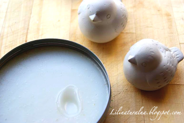 W kąpieli wodnej w miseczce roztapiacie masło kokosowe i wosk. Do tego dodajecie zmielone płatki owsiane i cały czas, jeszcze przez chwilę, mieszacie. Następnie wyciągacie miseczkę z wody i dolewacie do niej olej ze słodkich migdałów, ciągle mieszając. Po krótkiej chwili dodajecie wodę kwiatową, bardzo powoli i nadal cały czas mieszając. Kiedy mieszanina nieco ostygnie i ma temperaturę pokojową, na koniec dolewanie około 5 kropelek olejku cytrynowego i 10 grejpfrutowego. I znowuż mieszacie. Całość przelewacie do słoiczka lub innego pojemniczka i odstawiacie w spokojne, chłodne miejsce. Tam masełko zastygnie.