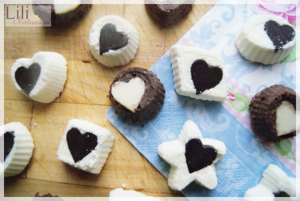 Na spód foremek kładziemy po jednym serduszku – z ciemnej czekolady do mlecznych pastylek, z białej do kakaowych. Przygotowane mieszaniny nakładamy do foremek, mocno ubijamy i pozostawiamy na noc do stwardnienia. Muszę się Wam przyznać, że te kakaowe pastylki wyszły mi nieco zbyt miękkie i za bardzo urosły przez noc. Dodałam po prostu za dużo wody oczarowej i kakao. Uważajcie zatem, żeby nie przedobrzyć:)
