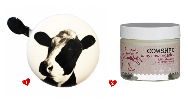 Zaczynamy od krów! Cudne są, a jakimś cudem natrafiłam aż na dwie! Ta pierwsza (1) to, wyobraźcie sobie, dzwonek do roweru! Ze świetnego sklepiku z oryginalnymi rowerowymi akcesoriami Bike Belle. Druga krówka umieszczona została na organicznych kosmetykach Cowshed (2). To tutaj to akurat kremik dla dzieci, ale marka ma w swej ofercie bardzo dużo produktów. U nas można je zakupić z tego co wiem w Zalando. Wyglądają bardzo ciekawie!