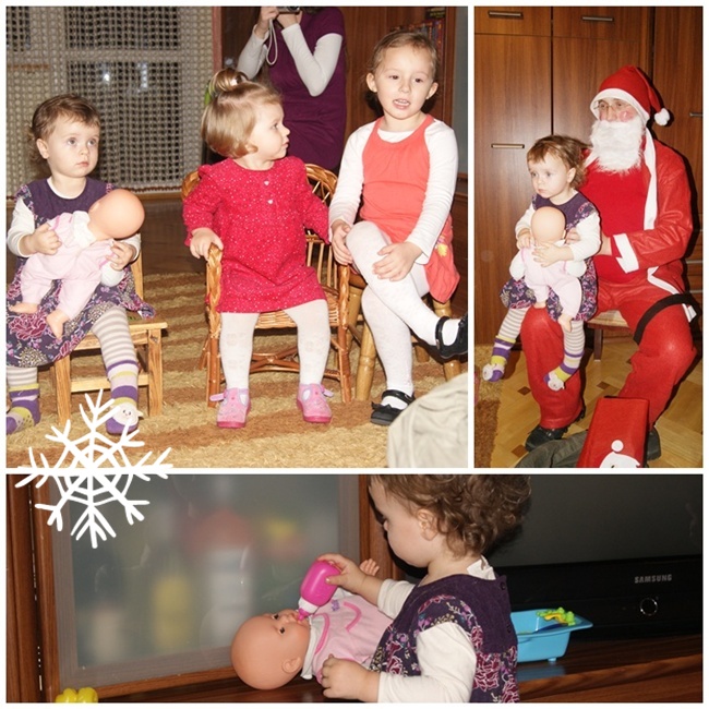 Przyszedł w tym roku… pierwszy raz… duży, straszny, czerwony pan, który rozdawał zabawki… Róża zdawała się być cały czas oszołomiona! Na szczęście towarzyszyły nam dwie urocze dziewczynki, które zaopiekowały się Różyczką i pozwoliły jej z kolei zaopiekować się ich lalą. Ale wrażeń było sporo!