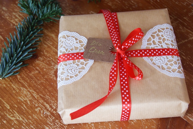 Do wykonania pierwszego prezentu wykorzystałam urocze papierowe serwetki, które nie kosztują drogo, a zmieniają oblicze każdego pakunku. Świetnie wyglądają szczególnie jako zamknięcie papierowych, szarych torebek. Zakupicie je w sklepach z produktami do rękodzieła (beads.pl, kreatywnyswiat.pl) lub na Allegro. Elementem przewijającym się przez cały mój świąteczny cykl jest czerwona wstążka w grochy. I tutaj doskonale się sprawdza.