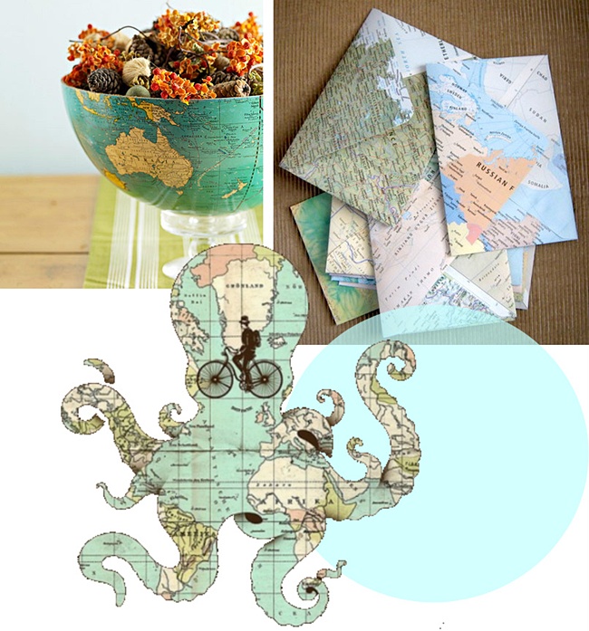See the World / globusowa misa / koperty z map / ośmiornica / pomysł na przyjęcie z mapą i globusami na stole / chustka / termos z Europą / globus vintage / wiszące tamborki mapowe / świat w jadalni / kolejny pomysł na przyjęcie lub wesele z globusem / globusy-lampy / globus jasny i globus ciemny / Let’s get lost / kolejny świat w jadalni z fioletowym stołem / wiszące globusy / mapa i globusy w pokoju dziennym / serduszka z map w ramkach / sylwetka z mapy / torebka na łańcuszku / torebka na pasku skórzanym / globusy jako dekoracja przy kominku / globus, skrzynki, singer…
