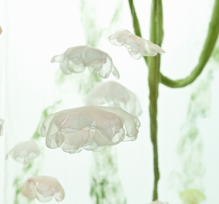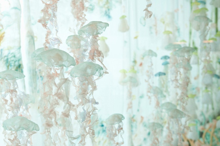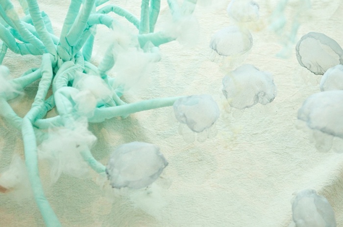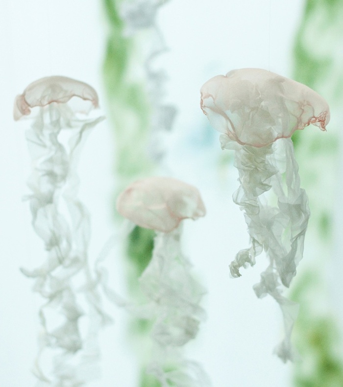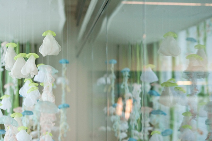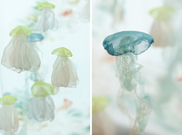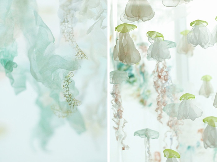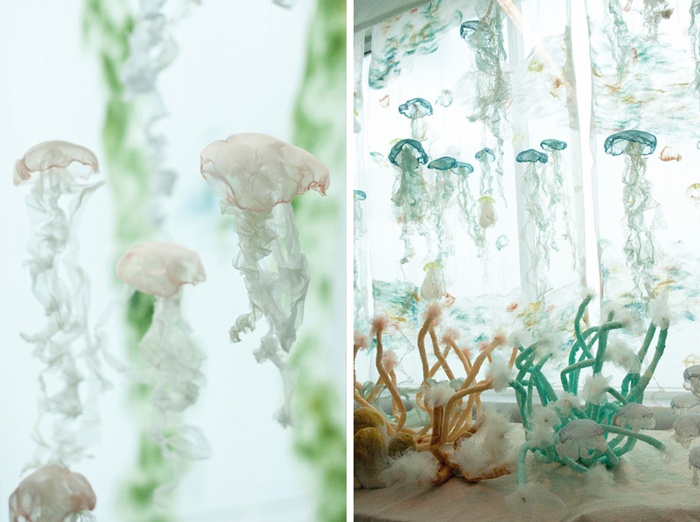 Stworzyła ona ogromną instalację pełną meduz z materiału… z tiulu, organzy… I jakimś cudem tchnęła w nie życie! Są tak delikatne, tak subtelne, że przestają być straszne. Stały się sztuką, którą aż chce się podziwiać. Całe to niesamowite akwarium ulokowane zostało w przejściu na lotnisku, w miejscu, które z morzem nie ma nic wspólnego. I właśnie dlatego staje się tak wyjątkowe. Jestem pewna, że przechodnie patrzą w zdumieniu, oglądają i na chwilę przenoszą się gdzieś zupełnie indziej. I na tą chwilkę problemy przestają być istotne. Zwyciężają meduzy!