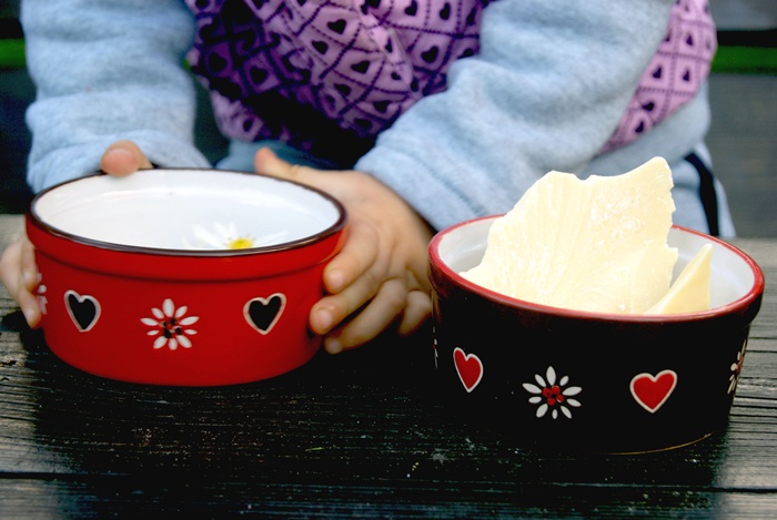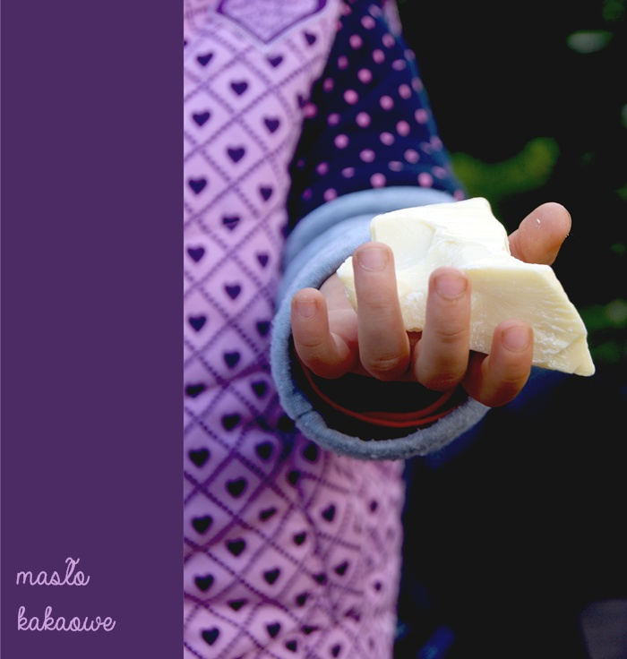 Masło kakaowe. Próbowaliście? Dotychczas miałam je jedynie w formie małych pastylek. Tym razem zakochałam się w takich naturalnych kosteczkach. Cudowne. Pachnie czekoladą. Twarde jest bardzo, jak to masło kakaowe, ale to nic. Urywam kawałek, rozgrzewam w dłoniach i powoli masuję ciało. Trochę nakładam na usta i zaraz je oblizuję. Wchłania się od razu, nawilża i odżywia. Kawałeczek wrzucony do kąpieli ułatwi zadanie. Masło się powoli roztopi i pozostawi na skórze delikatny film. Polecam!