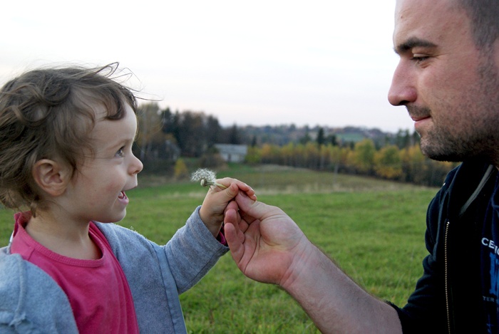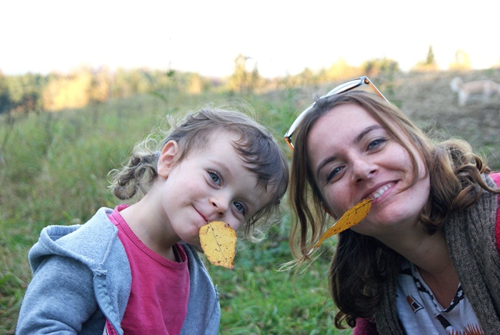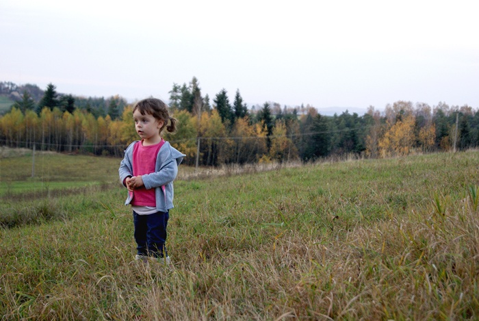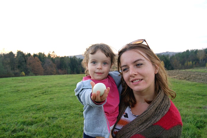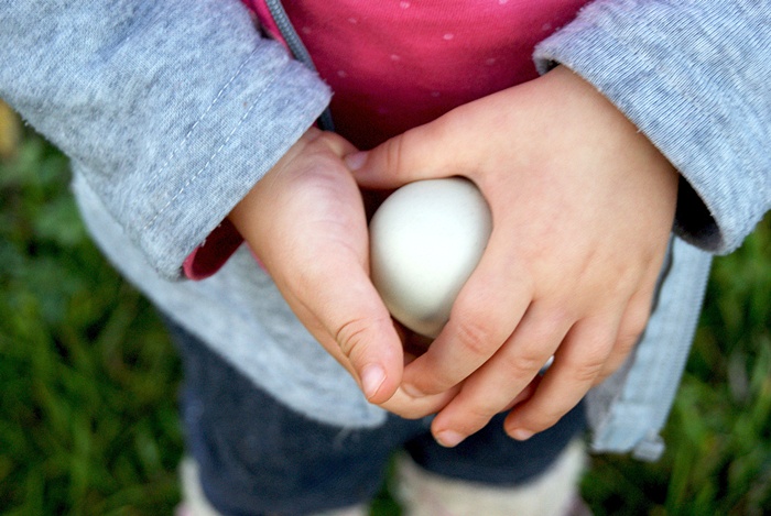 Kiedy powstał wianek, poszliśmy sobie na spacer. Spotkaliśmy tam starszą panią z pobliskiego gospodarstwa, która podarowała Róży jajo od panoszących się wszędzie kur. Jakiż to był skarb! I z jaką chęcią to jajo zostało potem zjedzone! 🙂