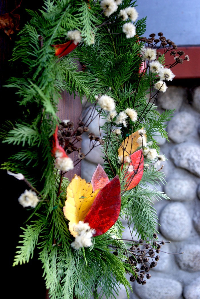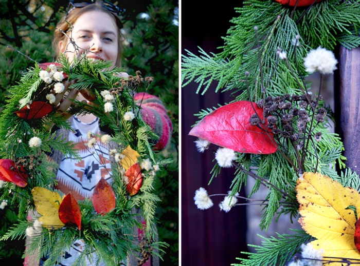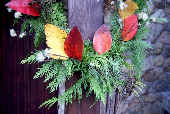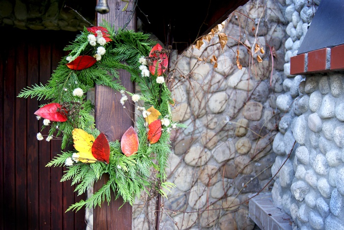 Do mojego wianka wykorzystałam tuję, ale z pewnością możecie pokombinować z innymi iglakami. Są swoistą podstawą dalszej zabawy. Wypełniają przestrzeń wianka i stanowią tło dla kolorowych dodatków. Pomiędzy zielone gałązki powtykałam puszystego clematisa, wiszącego na ogrodzeniu domku, nieco zeschniętego wrotycza i liście jesienne – te czerwone to borówka amerykańska. Z liśćmi jest taki problem, że jeśli są jeszcze świeże, wilgotne, szybko się zwiną i uschną. Jeśli więc chcielibyście, aby wianek wytrzymał dłużej niż jako ozdoba niedzielnej rodzinnej imprezy, ususzcie je najpierw, zamykając pomiędzy kartkami książki.