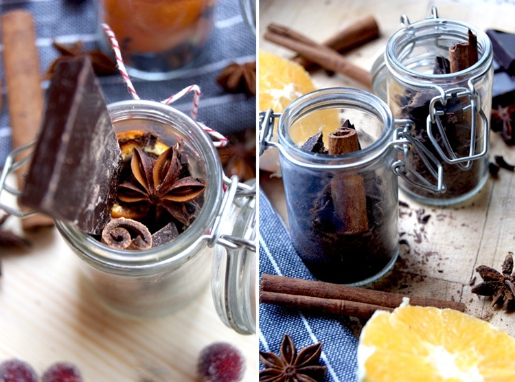 Do słoiczków przeznaczonych do grzanego wina wkładamy po trochę skórki, przepołowionych lasek cynamonu, goździki i anyż. Do pozostałych wsypujemy kolejno startą lub drobno pokrojoną czekoladę, szczyptę przyprawy piernikowej, połowę laski cynamonu, gwiazdkę anyżu, kawałeczek skórki z pomarańczy i 2-3 goździki. Słoiczki zamykamy, obwijamy dla dekoracji wstążką lub sznureczkiem i pakujemy po dwa do pudełek prezentowych. No i rozkoszujemy się gorącymi napojami!