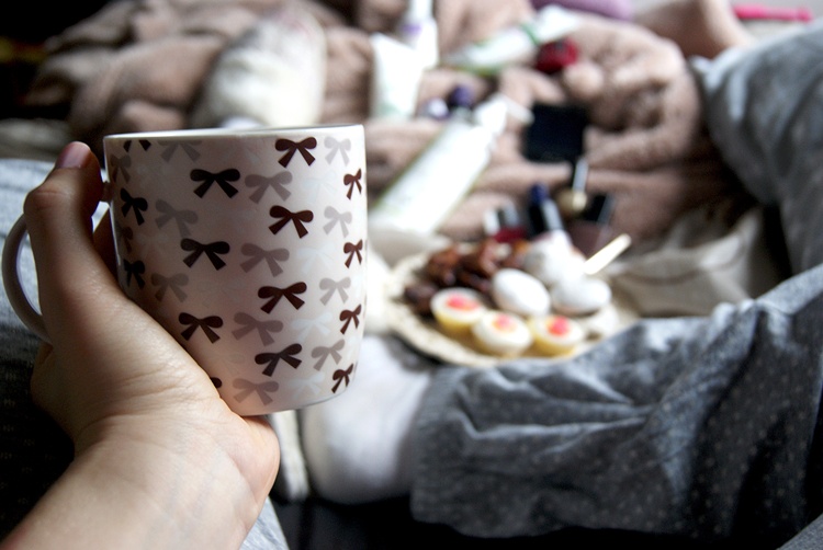 Ja najbardziej lubię herbatę z cytryną 🙂 Do tego kąpiel w wannie i domowe spa 😀 Jeśli mam więcej czasu, to książka lub film :))