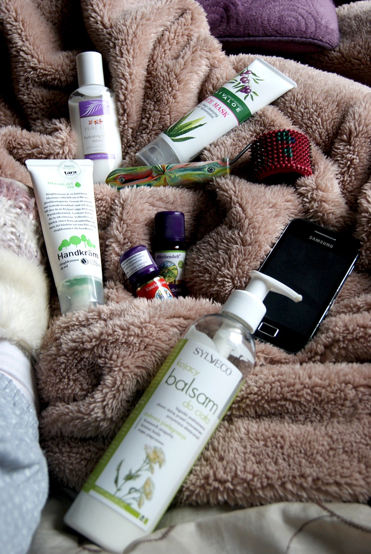 Jak się rozpieszczamy to dokładnie! Czyli ciałko też. Jest to odpowiednia chwila dla wszelkiej maści balsamów i maseczek. W domu w różnych miejscach mam porozstawiane kremy do rąk, po które sięgam kilka razy na dzień. W tym momencie królują te z Olivaloe i Naturligtvis. Zanim się położę pod kocykiem nasmaruję nogi i brzuszek balsamami Sylveco lub Pure Fiji. Chwytam moje ulubione narzędzie tortur – wałek wieloigłowy dr Lyapko i czytając coś, przejeżdżam nim lekko po twarzy i szyi. Trochę ujędrnienia od niechcenia nie zaszkodzi!