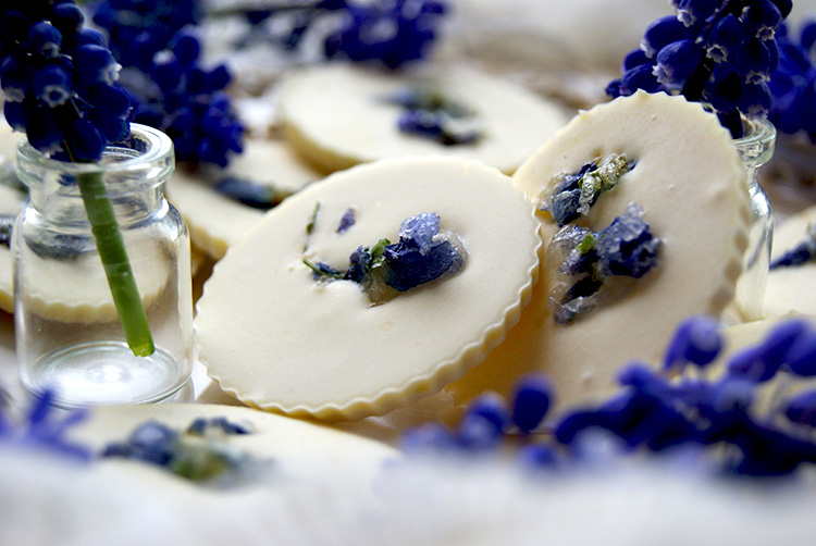 I to jakie! Czekoladki wykwintnie fiołkowe. Białe, bo na takich ładnie się fiołki komponują. Możemy oczywiście użyć tutaj świeżych, właśnie zerwanych kwiatów. Wtedy ich aromat będzie intensywniejszy. Ja jednak postanowiłam w końcu wypróbować pomysł na fiołki w cukrze. Robi się je dosyć prosto, a już same wyglądają i smakują jak małe cukiereczki. Do dekoracji są idealne!