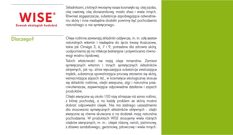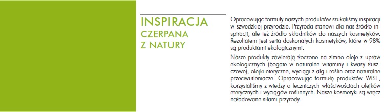 Kosmetyki WISE, co ważne, są certyfikowane ekologicznie i tworzone w oparciu o tłoczone na zimno oleje, olejki eteryczne, wyciągi z alg i roślin. Zgodnie z filozofią marki nie zawierają olejów mineralnych i innych pochodnych przemysłu petrochemicznego, SLS/SLES, syntetycznych barwników czy sztucznych substancji zapachowych.