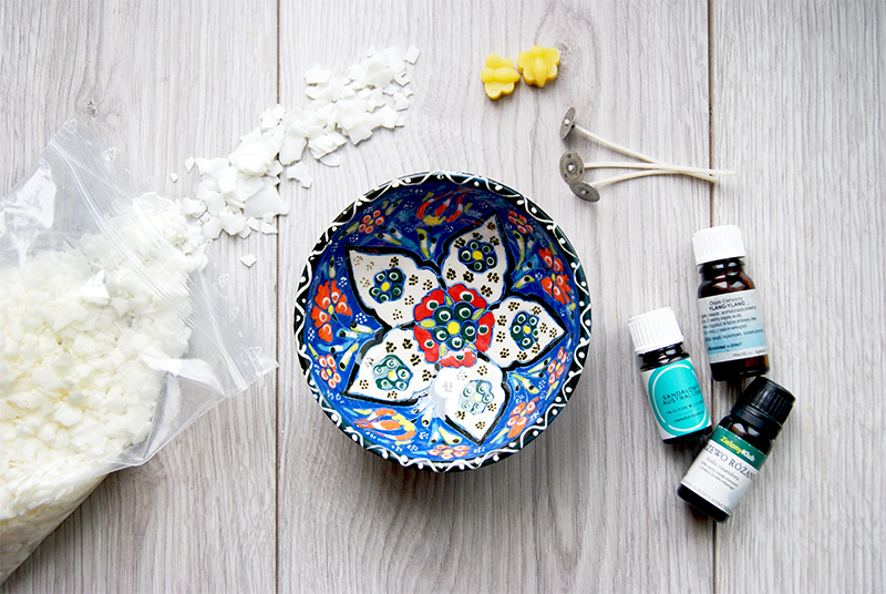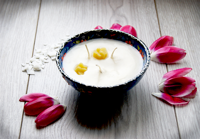 Roztapiamy ok. 2 łyżki wosku sojowego i wlewamy go na spód miseczki. Ustawiamy w niej knoty w odpowiednim miejscu i czekamy chwilę, przytrzymując je palcami, aż wosk stwardnieje. Dzięki temu będą one stabilne. Roztapiamy pozostały wosk sojowy. Ściągamy z ognia i odczekujemy chwilę, aż odrobinę ostygnie, ale jeszcze zanim zacznie gęstnieć. Wlewamy do niego olejki eteryczne i dokładnie mieszamy. Wosk przelewamy do miseczki. Aby knoty się w nim nie zatopiły, podtrzymujemy je patyczkami. Zanim świeca w pełni stężeje, ustawiamy na niej pszczółki. I gotowe! Świecę zapalamy tuż przed romantycznym wieczorem, aby zapach wypełnił pokój!