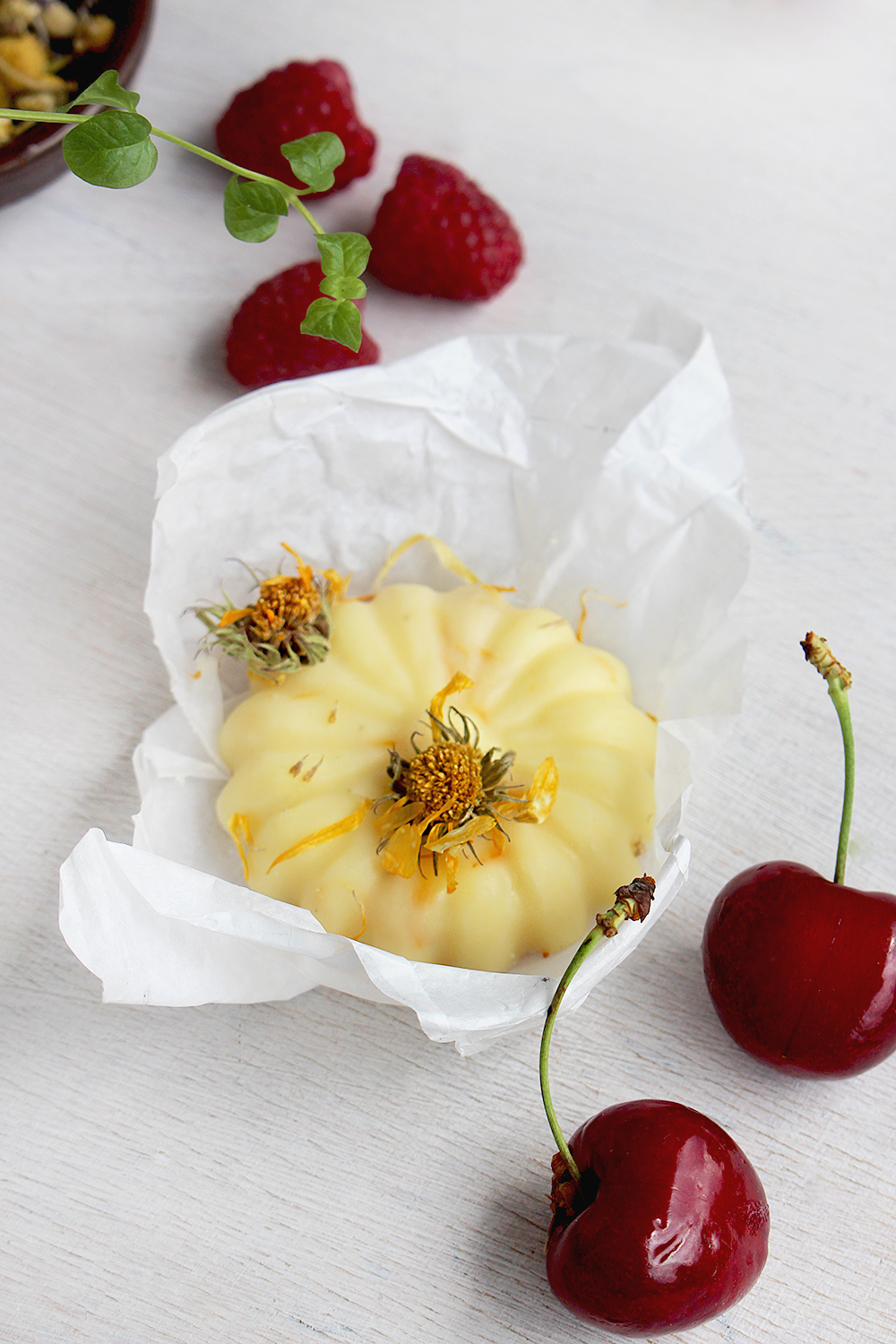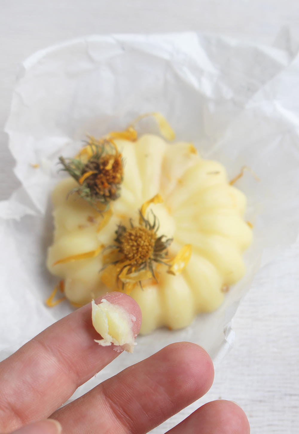 To, co wiem na pewno, to w tym uroczym maślanym nagietku, w obsypanym nagietkowym suszem balsamie w kostce, który zachwyca wizualnie i odurza (ale pozytywnie) zapachem, mamy masło shea, wosk pszczeli, macerat z ekologicznego nagietka oraz olejki eteryczne z bergamotki, pomarańczy, cytryny, limonki, paczuli. Trzeba przyznać, że nie przyszło by mi samej do głowy połączyć nuty cytrusowe z intensywnym paczuli, ale to naprawdę działa! Aromat pozostaje na skórze do następnego dnia, intryguje i kusi.