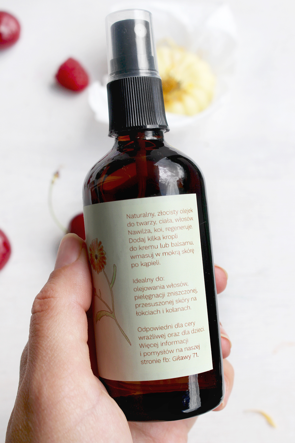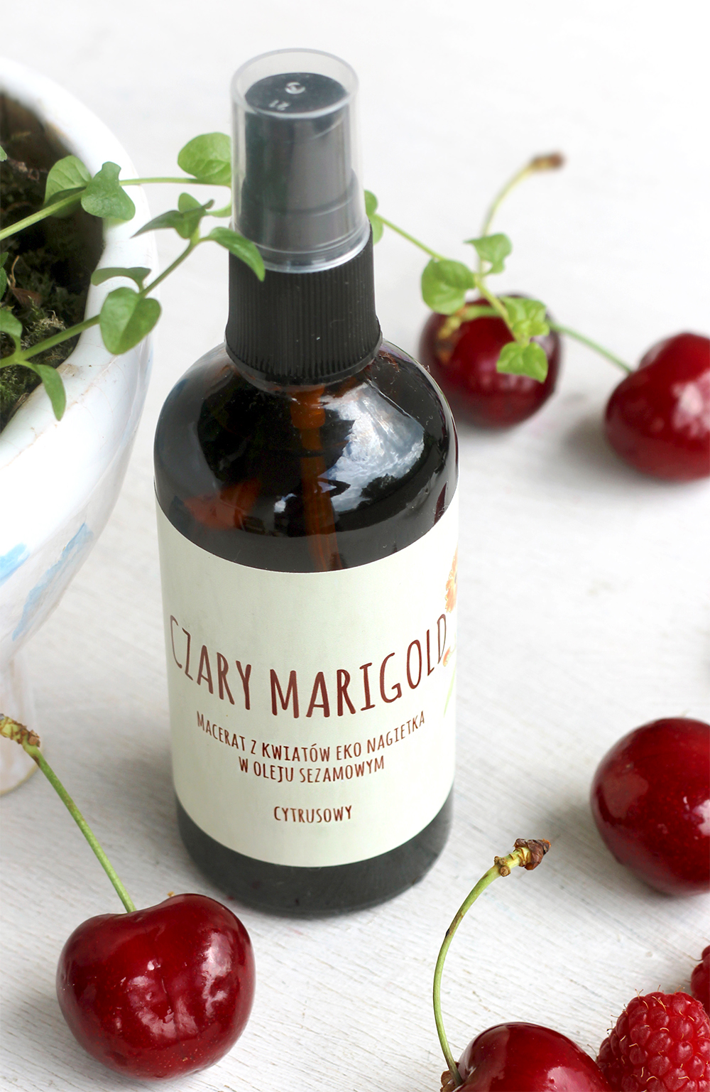 W buteleczce natomiast mamy macerat z nagietka w oleju sezamowym z domieszką olejków z cytryny, pomarańczy i bergamotki. Zapach zniewala. Mam wrażenie, jakbym pachniała… ciasteczkami! Energetyzującymi ciasteczkami z ukrytą mocą.