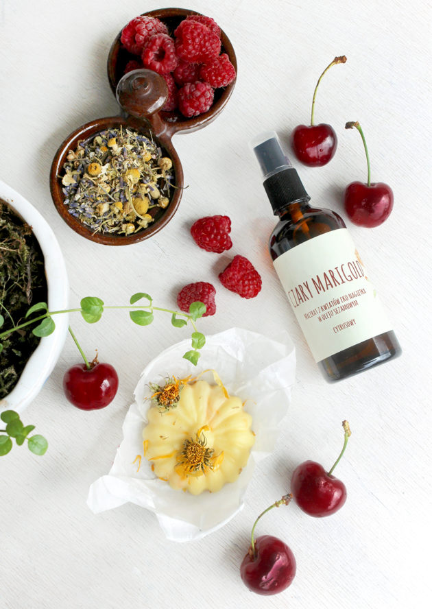 Dwa cuda! Cudeńka! W których nie tylko znajdziemy oleje i olejki, nie tylko to, co najlepsze z nagietka… Mam wręcz nieodparte poczucie, że w tej niepozornej buteleczce i w aluminiowej puszeczce, w której schowany był balsam w kostce, dodano jakieś czary (o czym z resztą mówi nam sama etykieta). Może jakąś tajemną alchemiczną energię? Może jakiś kosmiczny pierwiastek? Może ducha warmińskich lasów i jezior?